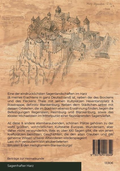 Eine der eindrücklichsten Sagenlandschaften im Harz ist, neben der des Brockens und des Fleckens Thale mit seinen Kultplätzen Hexentanzplatz und Rosstrappe, definitiv Blankenburg. Neben dem Städtchen selbst mit dessen Ortsteilen, die im Büchlein ebenso Erwähnung finden, liegen die Befestigungen Regenstein, Heimburg und Blankenburg, sowie das Kloster Michaelstein im Mittelpunkt einer faszinierenden Sagenvielfalt. All diese und andere atemberaubenden, schönen Plätze gehören zu der wohl größten, vorchristlichen Kultstätte Europas. Wundersam, aber daher nicht verwunderlich, dass es über 100 Sagen gibt, die von jenen Kraftplätzen berichten; Geschichten, die den alten Glauben und das geheime Wissen unserer Altvorderen wiederspiegeln. Lass dich verzaubern von altüberlieferten Ritualen und den Heiligtümern Blankenburgs.