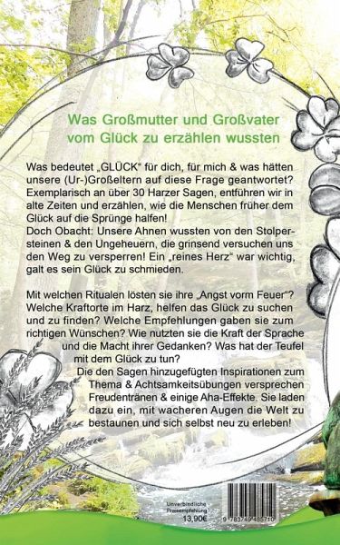 Was bedeutet GLÜCK für dich, für mich & was hätten unsere (Ur)Großeltern auf diese Frage geantwortet? Exemplarisch an über 30 Harzer Sagen, entführen wir in alte Zeiten & erzählen, wie die Menschen früher dem Glück auf die Sprünge halfen! Doch Obacht: Unsere Ahnen wussten von den Stolpersteinen & den Ungeheuern, die grinsend versuchen uns den Weg zu versperren! Ein reines Herz war unerlässlich, galt es sein Glück zu schmieden. Mit welchen Ritualen lösten sie ihre Angst vorm Feuer? Welche Kraftorte im Harz, helfen das Glück zu suchen & zu finden? Welche Empfehlungen gaben sie zum richtigen Wünschen? Wie nutzten sie die Kraft der Sprache & die Macht ihrer Gedanken? Die den Sagen angeschmiegten Inspirationen zum Thema & Achtsamkeitsübungen versprechen Freudentränen & einige Aha-Effekte. Sie laden dazu ein, mit wacheren Augen die Welt zu bestaunen & sich selbst neu zu erleben!