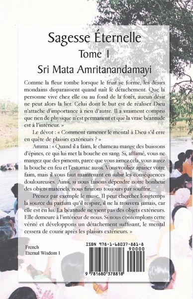 Comme la fleur tombe lorsque le fruit se forme, les désirs mondains disparaissent quand naît le détachement. Que la personne vive chez elle ou au fond de la forêt, aucun désir ne peut alors la lier. Celui dont le but est de réaliser Dieu n'attache d'importance à rien d'autre. Il a vraiment compris que rien de physique n'est permanent et que la vraie béatitude est à l'intérieur. Le dévot : Comment ramener le mental à Dieu s'il erre en quête de plaisirs extérieurs ? Amma : Quand il a faim, le chameau mange des buissons d'épines, ce qui lui met la bouche en sang. Si, affamé, vous ne mangez que des piments, parce que vous aimez cela, vous aurez la bouche en feu et l'estomac aussi. Vous vouliez apaiser votre faim, mais il vous faut maintenant en subir les conséquences douloureuses. Ainsi, si nous faisons dépendre notre bonheur des objets matériels, nous finirons toujours par souffrir. Prenez par exemple le musc. Il peut chercher longtemps la source du parfum qu'il respire, il ne la trouvera jamais, car elle est en lui. La béatitude ne vient pas des objets extérieurs. Elle demeure à l'intérieur de nous. Si nous contemplons cette vérité et développons un détachement suffisant, le mental cessera de courir après les plaisirs extérieurs. Published By The Disciples Of Mata Amritanandamayi Devi, Affectionately Known As Mother, Or Amma The Hugging Saint.