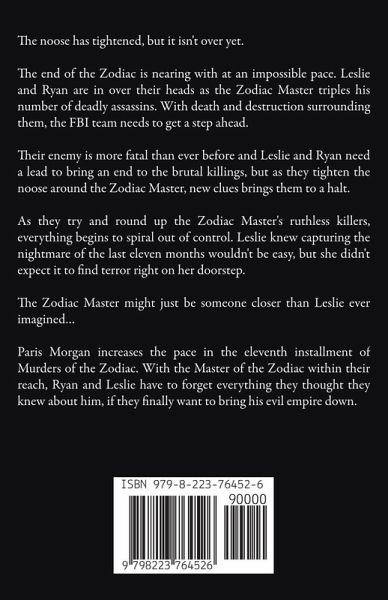 The noose has tightened, but it isn't over yet. The end of the Zodiac is nearing with at an impossible pace. Leslie and Ryan are in over their heads as the Zodiac Master triples his number of deadly assassins. With death and destruction surrounding them, the FBI team needs to get a step ahead. Their enemy is more fatal than ever before and Leslie and Ryan need a lead to bring an end to the brutal killings, but as they tighten the noose around the Zodiac Master, new clues brings them to a halt. As they try and round up the Zodiac Master's ruthless killers, everything begins to spiral out of control. Leslie knew capturing the nightmare of the last eleven months wouldn't be easy, but she didn't expect it to find terror right on her doorstep. The Zodiac Master might just be someone closer than Leslie ever imagined… Paris Morgan increases the pace in the eleventh installment of Murders of the Zodiac. With the Master of the Zodiac within their reach, Ryan and Leslie have to forget everything they thought they knew about him, if they finally want to bring his evil empire down.