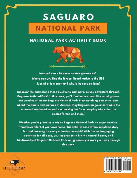 Learn about Saguaro National Park and have fun at the same time! Activity book for kids ages 8 to 11. Encourage young nature lovers to learn about Saguaro National Park. This book is filled with fun and educational activities like mazes, mad libs, word games, and puzzles. Play matching games about the plants and animals that live in the park. Learn about Leave No Trace principles and consider your impact on the land. Unscramble things to do in Arizona, decode clues about other national parks, make a packing list for a camping trip, and color some cactus. Kids will also learn about conservation while using their imaginations to pretend they are a park ranger. This standout activity book includes: ¿ 45 pages of independent activities¿Unscramble names of rattlesnakes, decode clues using the American Manual Alphabet (ASL), practice sound observation, design a butterfly, and more! ¿ Range of adaptable activities for anywhere¿The activity pages offer complementary learning with or without a visit to Saguaro National Park. Activities are appropriate and adaptable so all kids can start learning, no matter where they are. ¿ Important skill-building¿By stopping to notice and record what's going on around them, kids will practice important skills like creative thinking, observation, writing, drawing, wilderness safety, and more. This book is great for long car rides, screen-free time, vacation, camping trips, or a trip to Saguaro National Park.
