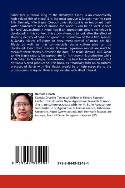 Sahar (Tor putitora), king of the Himalayan fishes, is an economically high valued fish of Nepal & is the most popular & largest riverine sport fish. Similarly, Nile tilapia (Oreochromis niloticus) is an important fresh water aquaculture species around the world & can be an ideal species for rural aquaculture in Nepal too if an appropriate culture technique is developed. In this context, this study attempts to look after the effect of stocking density of Sahar on growth & production of these two species; & Sahar's relative efficiency on recruitment control of mixed sex Nile Tilapia as well, so that commercially viable culture plan can be developed. Descriptive analysis & linear regression model are used to measure these effects & describe the data. The result showed 1:33 Sahar to Nile tilapia ratio to be appropriate for fish growth & production while 1:16 Sahar to Nile tilapia ratio revealed the best for recruitment control of tilapia & seed production. This book, as it basicallytalks on co-cultural practices of Sahar with Nile tilapia, would be of help especially to the professionals in Aquaculture & anyone else with allied interest.