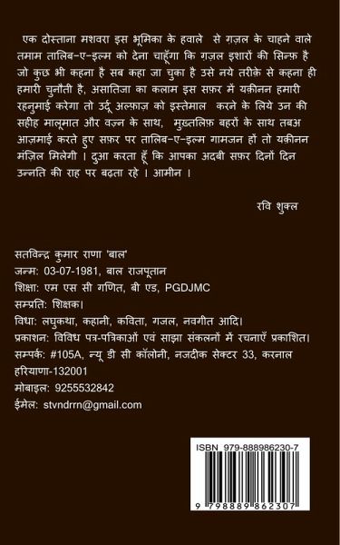 Sahra Mein Pani mein darz gazlon mein tamam samajik sarokar hain. alfaz ki shaistagi hai to lahze ki narmi bhi hai. yah shayar ka pahla sheri mazmua hai. kaushishein rang laati hainaur yah pahlikaushish hi dil ko chhoone wali hai.in gazlon mein shayar ka jiya hua anubhav hai jo paathakon ko prabhavit karta hai.andaaze bayan sadagi aur shbdon ki saralata sher ke sanpratshan ki zamin hai jo pathakon ko kahin bhi nirash nhin karegi.