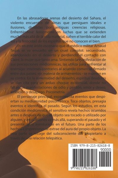 En las abrasadoras arenas del desierto del Sahara, el violento encuentro de almas que persiguen ideales e ilusiones, divididas por antiguas creencias religiosas. Enfrentándose ferozmente en luchas que se extienden mucho más allá de la vida material, sufren el terrible calor del sol y la ferocidad de los espíritus que no conocen el bien. Es en este árido escenario que el médico militar Arnaud Teqak se ve envuelto en un cruel complot: secuestrado, abandonado en el desierto y perdiendo el contacto con Claire, la mujer que tanto ama. Sintiendo la manifestación de sus percepciones mediúmnicas, las utiliza para enfrentar al enemigo: intereses contrarios al acuerdo comercial firmado entre dos países -en materia de armamentos - se mueven en su contra. En la inmensidad del desierto, espíritus deudores se dan cita para un arduo choque existencial, donde no faltan las manifestaciones de odio y perdón, amor y deseo, ambición y desapego. Psicometría. El personaje principal, experimenta eventos que despiertan su mediumnidad psicométrica. Toca objetos, presagia eventos e identifica el pasado. Según los estudios, en esta condición mediúmnica, el sensitivo revela hechos ocurridos antes o después de que el objeto sea tocado o utilizado por alguien, y en ocasiones va más allá, superando el pasado y el presente, para aventurarse en el futuro. Una parte de los hechos e impresiones se extrae del aura del propio objeto. La otra parte se recoge del subconsciente del propietario a través de una relación telepática.