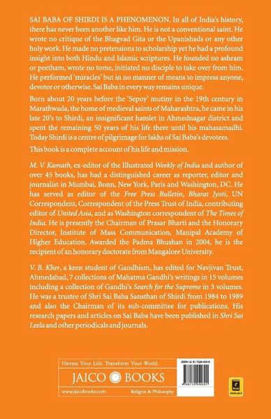 A UNIQUE SAINT SAI BABA OF SHIRDI IS A PHENOMENON. In all of India's history, there has never been another like him. He is not a conventional saint. He wrote no critique of the Bhagvad Gita or the Upanishads or any other holy work. He made no pretensions to scholarship yet he had a profound insight into both Hindu and Islamic scriptures. He founded no ashram or peetham, wrote no tome, initiated no disciple to take over from him. He performed 'miracles' but in no manner of means to impress anyone, devotee or otherwise. Sai Baba in every way remains unique. Born about 20 years before the 'Sepoy' mutiny in the 19th century in Marathwada, the home of medieval saints of Maharashtra, he came in his late 20's to Shirdi, an insignificant hamlet in Ahmednagar district and spent the remaining 50 years of his life there until his mahasamadhi. Today Shirdi is a centre of pilgrimage for lakhs of Sai Baba's devotees. This book is a complete account of his life and mission.