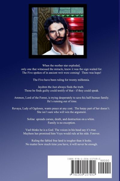 When the mother star exploded, only one that witnessed the miracle, knew it was the sign waited for. The Five spoken of in ancient writ were coming! There was hope! The Five have been ruling for twenty millennia. Jaydren the Just always finds the truth. Those he finds guilty could testify of that - if they could speak. Ammon, Lord of the Forest, is trying desperately to save his half-human family. He's running out of time. Revaya, Lady of Ogdones, wants peace at any cost. The harpy part of her doesn't. She isn't sure who will win the argument. Soline spreads curses, death, and destruction on a whim. Family is no exception. Vael thinks he is a God. The voices in his head say it's true. Mayhem has promised him Veya would rule at his side. Forever. Ruling the fabled free land is tougher than it looks. No matter how much time you have, it will never be enough.