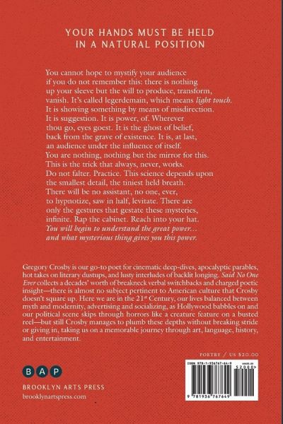 Gregory Crosby is our go-to poet for cinematic deep-dives, apocalyptic parables, hot takes on literary dustups, and lusty interludes of backlit longing. Said No One Ever collects a decades' worth of breakneck verbal switchbacks and charged poetic insight-there is almost no subject pertinent to American culture that Crosby doesn't square up. Here we are in the 21st Century, our lives balanced between myth and modernity, advertising and socializing, as Hollywood babbles on and our political scene skips through horrors like a creature feature on a busted reel-but still Crosby manages to plumb these depths without breaking stride or giving in, taking us on a memorable journey through art, language, history, and entertainment.