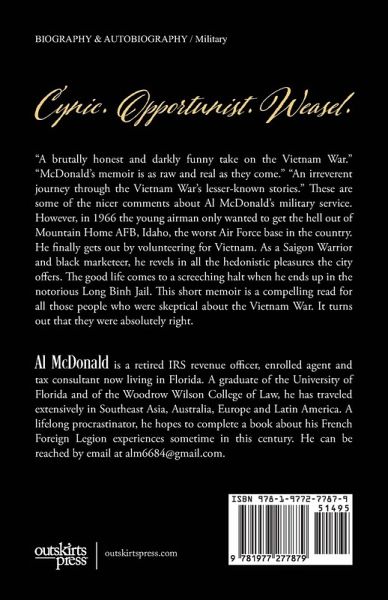 Cynic. Opportunist. Weasel. "A brutally honest and darkly funny take on the Vietnam War." "McDonald's memoir is as raw and real as they come." "An irreverent journey through the Vietnam War's lesser-known stories." These are some of the nicer comments about Al McDonald's military service. However, in 1966 the young airman only wanted to get the hell out of Mountain Home AFB, Idaho, the worst Air Force base in the country. He finally gets out by volunteering for Vietnam. As a Saigon Warrior and black marketeer, he revels in all the hedonistic pleasures the city offers. The good life comes to a screeching halt when he ends up in the notorious Long Binh Jail. This short memoir is a compelling read for all those people who were skeptical about the Vietnam War. It turns out that they were absolutely right. "McDonald's memoir is as raw and real as they come." "An irreverent journey through the Vietnam War's lesser-known stories." These are some of the nicer comments about Al McDonald's military service. However, in 1966 the young airman only wanted to get the hell out of Mountain Home AFB, Idaho, the worst Air Force base in the country. He finally gets out by volunteering for Vietnam. As a Saigon Warrior and black marketeer, he revels in all the hedonistic pleasures the city offers. The good life comes to a screeching halt when he ends up in the notorious Long Binh Jail. This short memoir is a compelling read for all those people who were skeptical about the Vietnam War. It turns out that they were absolutely right.