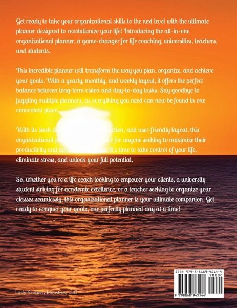 Get ready to take your organizational skills to the next level with the ultimate planner designed to revolutionize your life! Introducing the all-in-one organizational planner, a game-changer for life coaching, universities, teachers, and students. This incredible planner will transform the way you plan, organize, and achieve your goals. With a yearly, monthly, and weekly layout, it offers the perfect balance between long-term vision and day-to-day tasks. Say goodbye to juggling multiple planners, as everything you need can now be found in one convenient place. With its sleek design, durable construction, and user-friendly layout, this organizational planner is a must-have for anyone seeking to maximize their productivity and achieve their goals. It's time to take control of your life, eliminate stress, and unlock your full potential. So, whether you're a life coach looking to empower your clients, a university student striving for academic excellence, or a teacher seeking to organize your classes seamlessly, this organizational planner is your ultimate companion. Get ready to conquer your goals, one perfectly planned day at a time!