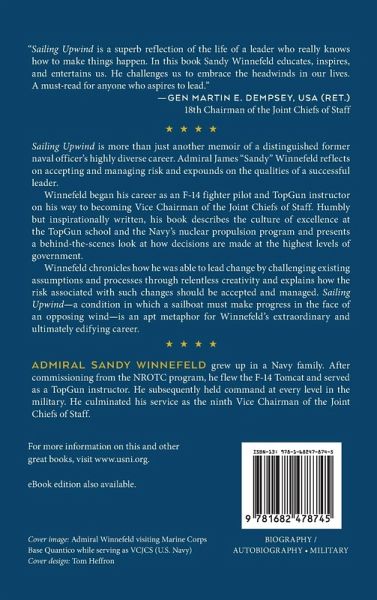 Sailing Upwind is more than just another memoir of a distinguished former naval officer‘s highly diverse career. This book by Admiral James “Sandy” Winnefeld is also intended to offer useful reflections regarding how he accepted and managed risk along the way, as well as a concise description of the qualities one must develop to become a successful leader. Winnefeld began his career as an F-14 fighter pilot and TOPGUN instructor, commanded an aircraft carrier, and then served in a variety of flag officer billets on the way to becoming the Vice Chairman of the Joint Chiefs of Staff. This book describes in an entertaining and humble manner how that journey unfolded and the lessons he attaches to it. The reader learns what it is like to become a Navy fighter pilot, and to fly, fight, and takeoff and land from an aircraft carrier – including a harrowing description of ejecting from an F-14 at night far from land. Winnefeld describes the culture of excellence at the real TOPGUN and the Navy's nuclear propulsion program. He recounts how he learned to lead the men and women who operate at every level of Navy operational command, from squadron to ship to fleet. Finally, the author presents a behind-the-scenes look at how decisions are made at the highest levels of government regarding whether and how those forces will be used, and how they are acquired. In the process, Winnefeld provides descriptions of how, by challenging existing assumptions and processes and through relentless creativity, he was able to lead change. He reflects on how the risk associated with such changes should be accepted and managed. The title Sailing Upwind—in which a sailboat must be operated against a prevailing force field to make progress in the right direction—is an apt metaphor for the bent for pushing against the system Winnefeld describes throughout the book.