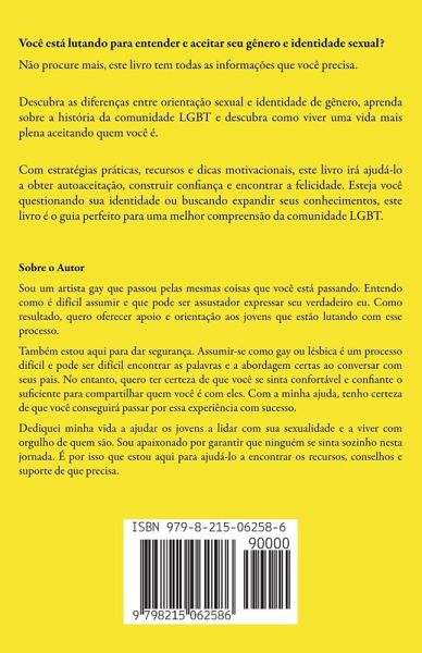 Você está lutando para entender e aceitar seu gênero e identidade sexual? Não procure mais, este livro tem todas as informações que você precisa. Descubra as diferenças entre orientação sexual e identidade de gênero, aprenda sobre a história da comunidade LGBT e descubra como viver uma vida mais plena aceitando quem você é. Com estratégias práticas, recursos e dicas motivacionais, este livro irá ajudá-lo a obter autoaceitação, construir confiança e encontrar a felicidade. Esteja você questionando sua identidade ou buscando expandir seus conhecimentos, este livro é o guia perfeito para uma melhor compreensão da comunidade LGBT. Dê o primeiro passo em direção a um futuro melhor e peça sua cópia deste livro perspicaz e fortalecedor hoje! Atenção leitores! Abrace a diversidade e aprenda sobre a importância de entender e aceitar a diversidade sexual e de gênero com nosso novo livro. Explore a diferença entre orientação sexual e identidade de gênero, descubra as diferenças entre homossexualidade e relaxamento clássico e descubra estratégias para viver melhor consigo mesmo. Coloque suas mãos neste livro perspicaz e transformador hoje! Sobre o Autor Sou um artista gay que passou pelas mesmas coisas que você está passando. Entendo como é difícil assumir e que pode ser assustador expressar seu verdadeiro eu. Como resultado, quero oferecer apoio e orientação aos jovens que estão lutando com esse processo. Também estou aqui para dar segurança. Assumir-se como gay ou lésbica é um processo difícil e pode ser difícil encontrar as palavras e a abordagem certas ao conversar com seus pais. No entanto, quero ter certeza de que você se sinta confortável e confiante o suficiente para compartilhar quem você é com eles. Com a minha ajuda, tenho certeza de que você conseguirá passar por essa experiência com sucesso. Dediquei minha vida a ajudar os jovens a lidar com sua sexualidade e a viver com orgulho de quem são. Sou apaixonado por garantir que ninguém se sinta sozinho nesta jornada. É por isso que estou aqui para ajudá-lo a encontrar os recursos, conselhos e suporte de que precisa.
