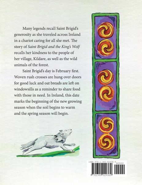 Many legends recall Saint Brigid's generosity as she traveled across Ireland in a chariot caring for all she met. The story of Saint Brigid and the King's Wolf recalls her kindness to the people of her village, Kildare, as well as the wild animals of the forest. Saint Brigid's day is February 1. Woven rush crosses are hung over doors for goodluck and oat breads are left on windowsills as a reminder to share food with those in need. In Ireland, this date marks the beginning of the new growing season when the soil begins to warm and the spring season will begin.