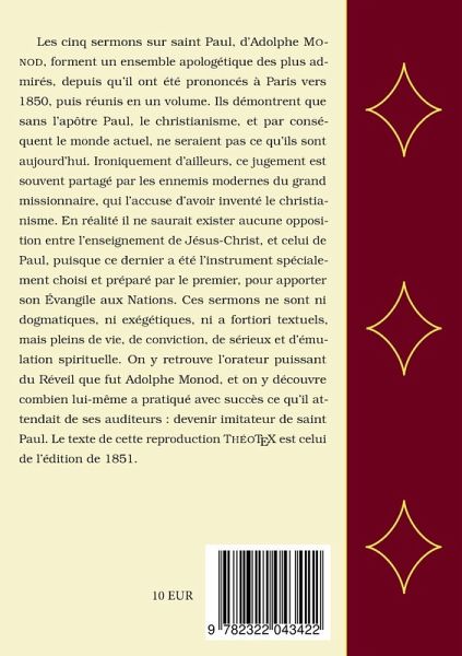Les cinq sermons sur saint Paul, d'Adolphe Monod, forment un ensemble apologétique des plus admirés, depuis qu'il ont été prononcés à Paris vers 1850, puis réunis en un volume. Ils démontrent que sans l'apôtre Paul, le christianisme, et par conséquent le monde actuel, ne seraient pas ce qu'ils sont aujourd'hui. Ironiquement d'ailleurs, ce jugement est souvent partagé par les ennemis modernes du grand missionnaire, qui l'accuse d'avoir inventé le christianisme. En réalité il ne saurait exister aucune opposition entre l'enseignement de Jésus-Christ, et celui de Paul, puisque ce dernier a été l'instrument spécialement choisi et préparé par le premier, pour apporter son Évangile aux Nations. Ces sermons ne sont ni dogmatiques, ni exégétiques, ni a fortiori textuels, mais pleins de vie, de conviction, de sérieux et d'émulation spirituelle. On y retrouve l'orateur puissant du Réveil que fut Adolphe Monod, et on y découvre combien lui-même a pratiqué avec succès ce qu'il attendait de ses auditeurs : devenir imitateur de saint Paul. Le texte de cette reproduction ThéoTeX est celui de l'édition de 1851.