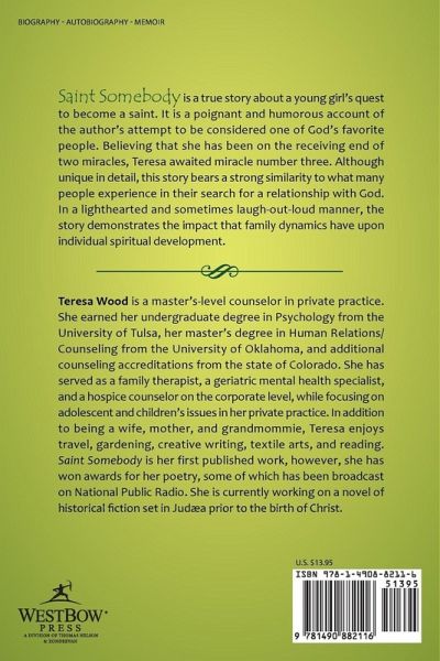 Saint Somebody is a true story about a young girl's quest to become a saint. It is a poignant and humorous account of the author's attempt to be considered one of God's favorite people. Believing that she has been on the receiving end of two miracles, Teresa awaited miracle number three. Although unique in detail, this story bears a strong similarity to what many people experience in their search for a relationship with God. In a lighthearted and sometimes laugh-out-loud manner, the story demonstrates the impact that family dynamics have upon individual spiritual development.