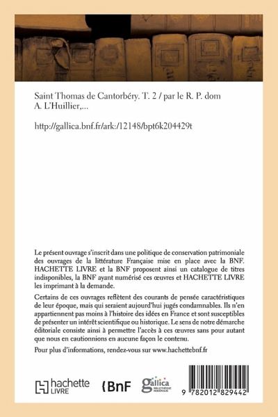 Saint Thomas de Cantorbéry. T. 2 / par le R. P. dom A. L'Huillier, ... Date de l'édition originale: 1891-1892 Sujet de l'ouvrage: Thomas Becket (saint; 1120-1170) Le présent ouvrage s'inscrit dans une politique de conservation patrimoniale des ouvrages de la littérature Française mise en place avec la BNF. HACHETTE LIVRE et la BNF proposent ainsi un catalogue de titres indisponibles, la BNF ayant numérisé ces oeuvres et HACHETTE LIVRE les imprimant à la demande. Certains de ces ouvrages reflètent des courants de pensée caractéristiques de leur époque, mais qui seraient aujourd'hui jugés condamnables. Ils n'en appartiennent pas moins à l'histoire des idées en France et sont susceptibles de présenter un intérêt scientifique ou historique. Le sens de notre démarche éditoriale consiste ainsi à permettre l'accès à ces oeuvres sans pour autant que nous en cautionnions en aucune façon le contenu. Pour plus d'informations, rendez-vous sur www.hachettebnf.fr