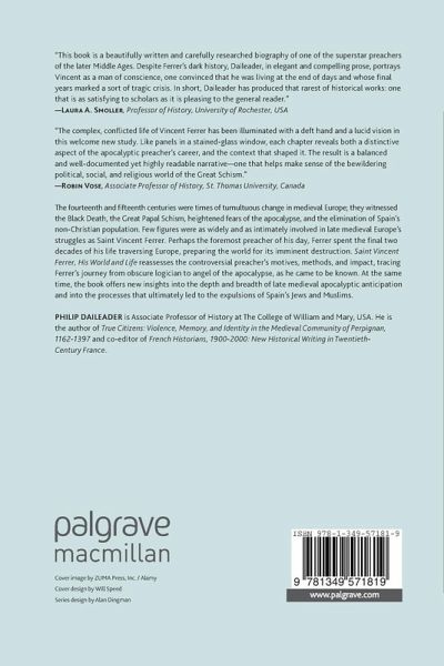 "Saint Vincent Ferrer, His World and Life is carefully researched and, above all, a good read. It brilliantly accomplishes the goals Daileader sets in the introduction. It presents a nuanced view of the period's most important evangelist by outlining the religious and social conditions that motivated his views. The apocalypticism that shaped his moral reform program and his efforts to segregate non-Christian communities also illuminates the process by which Spain came to reject its diverse religious past." (Sol Miguel-Prendes, Speculum, Vol. 94 (3), July, 2019)