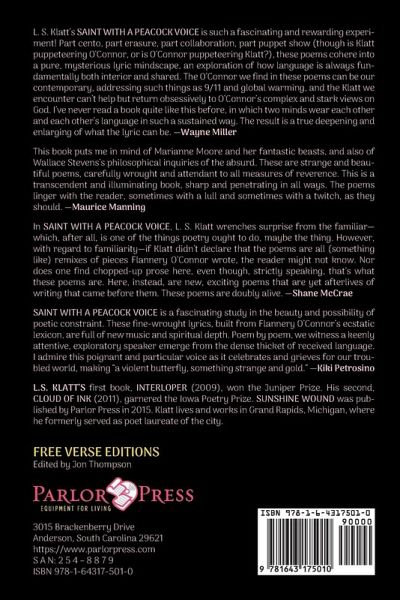 What People Are Saying L. S. Klatt's Saint with a Peacock Voice is such a fascinating and rewarding experiment! Part cento, part erasure, part collaboration, part puppet show (though is Klatt puppeteering O'Connor, or is O'Connor puppeteering Klatt?), these poems cohere into a pure, mysterious lyric mindscape, an exploration of how language is always fundamentally both interior and shared. The O'Connor we find in these poems can be our contemporary, addressing such things as 9/11 and global warming, and the Klatt we encounter can't help but return obsessively to O'Connor's complex and stark views on God. I've never read a book quite like this before, in which two minds wear each other and each other's language in such a sustained way. The result is a true deepening and enlarging of what the lyric can be. -Wayne Miller I can well imagine the poet savoring O'Connor's idiom, phrasings, and rhythms, as he combs through the work to find words to suit his purposes. The result is a bell-choir of language, unearthed from its original context and set into the ground of another. Now we have a collection of cranky poems that long for spiritual answers. Of course, those answers don't arrive, but the implied questions lurking behind the poems make themselves known by their absence, and the absence is a rich reward. This book puts me in mind of Marianne Moore and her fantastic beasts, and also of Wallace Stevens's philosophical inquiries of the absurd. These are strange and beautiful poems, carefully wrought and attendant to all measures of reverence. This is a transcendent and illuminating book, sharp and penetrating in all ways. The poems linger with the reader, sometimes with a lull and sometimes with a twitch, as they should. -Maurice Manning In Saint with a Peacock Voice, L. S. Klatt wrenches surprise from the familiar-which, after all, is one of the things poetry ought to do, maybe the thing. However, with regard to familiarity-if Klatt didn't declare that the poems are all (something like) remixes of pieces Flannery O'Connor wrote, the reader might not know. Nor does one find chopped-up prose here, even though, strictly speaking, that's what these poems are. Here, instead, are new, exciting poems that are yet afterlives of writing that came before them. These poems are doubly alive. -Shane McCrae Saint with a Peacock Voice is a fascinating study in the beauty and possibility of poetic constraint. These fine-wrought lyrics, built from Flannery O'Connor's ecstatic lexicon, are full of new music and spiritual depth. Poem by poem, we witness a keenly attentive, exploratory speaker emerge from the dense thicket of received language. I admire this poignant & particular voice as it celebrates & grieves for our troubled world, making "a violent butterfly, something strange and gold." -Kiki Petrosino About the Author L.S. Klatt's first book, Interloper, won the Juniper Prize, awarded by the University of Massachusetts Press. His second, Cloud of Ink, garnered the Iowa Poetry Prize from the University of Iowa Press. Sunshine Wound was published by Parlor Press in 2015. Klatt lives and works in Grand Rapids, Michigan, where he formerly served as poet laureate of the city.