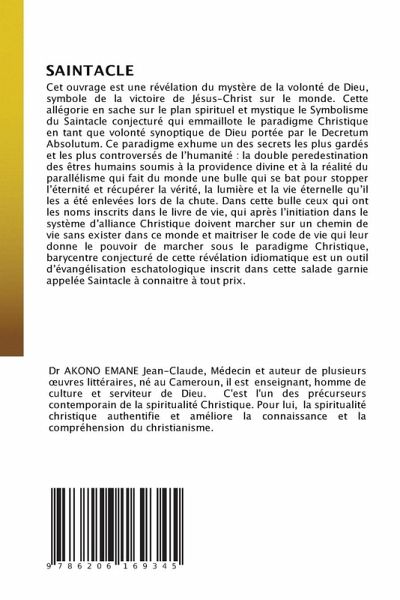 Cet ouvrage est une révélation du mystère de la volonté de Dieu, symbole de la victoire de Jésus-Christ sur le monde. Cette allégorie en sache sur le plan spirituel et mystique le Symbolisme du Saintacle conjecturé qui emmaillote le paradigme Christique en tant que volonté synoptique de Dieu portée par le Decretum Absolutum. Ce paradigme exhume un des secrets les plus gardés et les plus controversés de l'humanité : la double peredestination des êtres humains soumis à la providence divine et à la réalité du parallélisme qui fait du monde une bulle qui se bat pour stopper l'éternité et récupérer la vérité, la lumière et la vie éternelle qu'il les a été enlevées lors de la chute. Dans cette bulle ceux qui ont les noms inscrits dans le livre de vie, qui après l'initiation dans le système d'alliance Christique doivent marcher sur un chemin de vie sans exister dans ce monde et maitriser le code de vie qui leur donne le pouvoir de marcher sous le paradigme Christique, barycentre conjecturé de cette révélation idiomatique est un outil d'évangélisation eschatologique inscrit dans cette salade garnie appelée Saintacle à connaitre à tout prix.