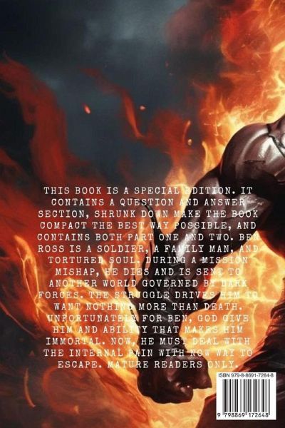 This book is a Special edition. It contains a Question and Answer section, shrunk down make the book compact the best way possible, and contains both part one and two. Ben Ross is a soldier, a family man, and tortured soul. During a mission mishap, he dies and is sent to another world governed by dark forces. The struggle drives him to want nothing more than death. Unfortunately for Ben, God give him and ability that makes him immortal. Now, he must deal with the internal pain with now way to escape. Mature readers only.