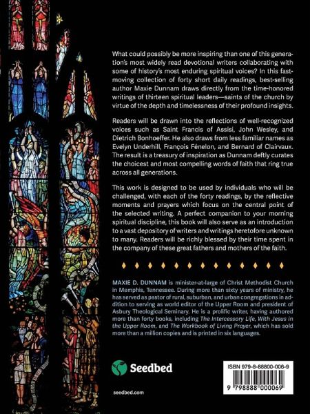 What could be more inspiring than one of this generation's most widely read devotional writers collaborating with some of history's most enduring spiritual voices? In this fast-moving collection of forty short daily readings, best-selling author Maxie Dunnam draws directly from the time-honored writings of thirteen spiritual leaders-saints of the church by virtue of the depth and timelessness of their profound insights. Readers will be drawn into the re¿ections of well-recognized voices such as Saint Francis of Assisi, John Wesley, and Dietrich Bonhoeffer. He also draws from less familiar names such as Evelyn Underhill, François Fénelon, and Bernard of Clairvaux. The result is a treasury of inspiration as Dunnam deftly curates the choicest and most compelling words of faith that ring true across all generations. This work is designed to be used by individuals who will be challenged, with each of the forty readings, by the re¿ective moments and prayers which focus on the central point of the selected writing. A perfect companion to your morning spiritual discipline, this book will also serve as an introduction to a vast depository of writers and writings unknown to many. Readers will be richly blessed by their time spent in the company of these great fathers and mothers of the faith.