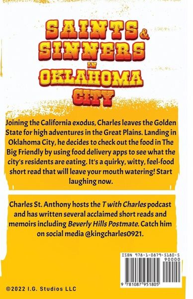Joining the California exodus, Charles leaves the Golden State for high adventures in the Great Plains. Landing in Oklahoma City, he decides to check out the food in The Big Friendly by using food delivery apps to see what the city's residents are eating. In this work of gonzo journalism, Charles finds some of the tastiest and most unique dishes he discovered while doing food delivery. Also, Charles uncovers how Oklahomans like their steaks prepared and how many orders of ranch dressing there were in the 500 plus orders he did in Oklahoma. Also, he compares the eating habits of Oklahoma City to the ones in Los Angeles with some shocking results. Which city has the better tippers? LA or OKC? The differences and similarities will surprise and astound you. It's a quirky, witty, feel-food short read that will leave your mouth watering! Start laughing now. Saints & Sinners in Oklahoma City is part food journal, part sociological case study, and 100% fun!