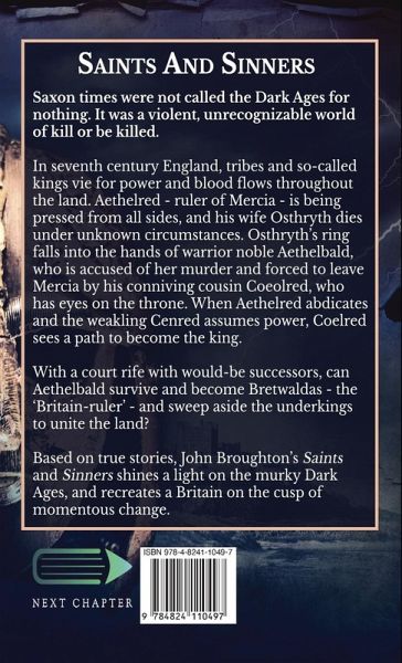 Saxon times were not called the Dark Ages for nothing. It was a violent, unrecognizable world of kill or be killed. In seventh century England, tribes and so-called kings vie for power and blood flows throughout the land. Aethelred - ruler of Mercia - is being pressed from all sides, and his wife Osthryth dies under unknown circumstances. Osthryth's ring falls into the hands of warrior noble Aethelbald, who is accused of her murder and forced to leave Mercia by his conniving cousin Coeolred, who has eyes on the throne. When Aethelred abdicates and the weakling Cenred assumes power, Coelred sees a path to become the king. With a court rife with would-be successors, can Aethelbald survive and become Bretwaldas - the 'Britain-ruler' - and sweep aside the underkings to unite the land? Based on true stories, John Broughton's Saints and Sinners shines a light on the murky Dark Ages, and recreates a Britain on the cusp of momentous change.