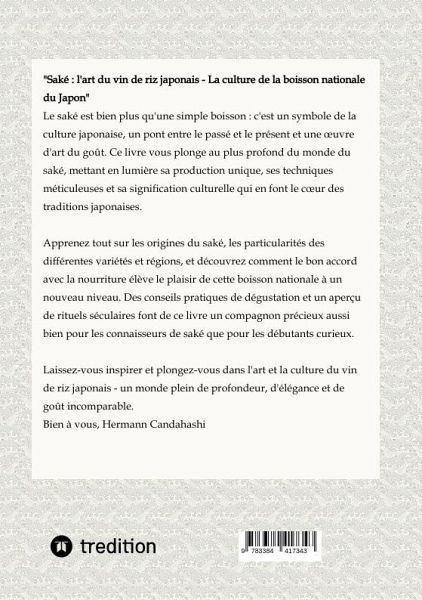 Découvrez le monde fascinant du vin de riz japonais dans _« Saké : l'art du vin de riz japonais - La culture de la boisson nationale du Japon »_. Ce livre vous emmène dans la riche histoire, les traditions profondément enracinées et le savoir-faire raffiné qui caractérisent le saké depuis des siècles. Idéal pour les connaisseurs comme pour les débutants, il offre de précieux aperçus sur les techniques de production, les particularités régionales et les nuances subtiles de la variété des saveurs.Découvrez comment le saké est apprécié, quels rituels et coutumes l'accompagnent et quelle importance il a dans la culture et la société japonaises. Des conseils pratiques sur la dégustation et les bons accords mets complètent les connaissances théoriques et font de ce livre un guide complet pour tous ceux qui souhaitent découvrir l'art du saké dans toute sa profondeur.Que vous soyez amateur de culture japonaise ou connaisseur de spiritueux raffinés, ce livre vous ouvre la porte d'un mondeplein de goût, de tradition et d'élégance. Plongez-vous et laissez-vous inspirer par l'art du saké !Bien à vous, Hermann Candahashi