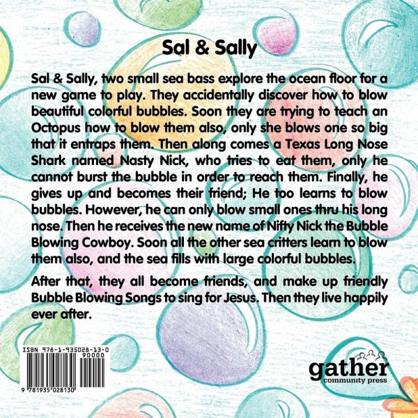Sal & Sally, two small sea bass explore the ocean floor for a new game to play. They accidentally discover how to blow beautiful colorful bubbles. Soon they are trying to teach an Octopus how to blow them also also, only she blows one so big that it entraps them. Then along comes a Texas Long Nose Shark named Nasty Nick, who tries to eat them, only he cannot burst the bubble in order to reach them. Finally, he gives up and becomes their friend; He too learns to blow bubbles. However, he can only blow small ones thru his long nose. Then he receives the new name of Nifty Nick the Bubble Blowing Cowboy. Soon all the other sea critters learn to blow them also, and the sea fills with large colorful bubbles. After that, they all become friends, and make up friendly Bubble Blowing Songs to sing for Jesus. Then they live happily ever after.