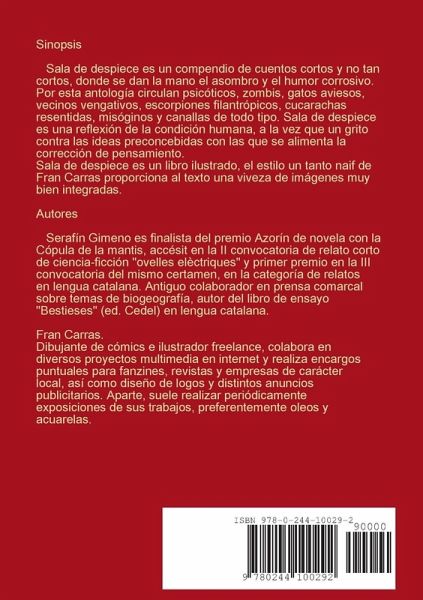 Sala de despiece es un compendio de cuentos cortos y no tan cortos, donde se dan la mano el asombro y el humor corrosivo. Por esta antología circulan psicóticos, zombis, gatos aviesos, vecinos vengativos, escorpiones filantrópicos, cucarachas resentidas, misóginos y canallas de todo tipo. Sala de despiece es una reflexión de la condición humana, a la vez que un grito contra las ideas preconcebidas con las que se alimenta la corrección de pensamiento. Sala de despiecees un libro ilustrado, el estilo un tanto naif de Fran Carras proporciona al texto una viveza de imágenesmuy bien integradas.