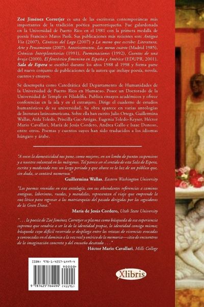 "A veces la domesticidad nos pone, como mujeres, en un limbo de puntos suspensivos y a nuestra voluntad en los márgenes. Tal parece ser el sentido de esta Sala de Espera, escrita y madurada tras un largo periodo y que ahora ve la luz de un público que, sin duda, se contará numeroso." Guillermina Wallas, Eastern Washington University "Los poemas reunidos en esta antología, con sus abundantes referencias a caminos antiguos, laberintos, ruedas, y mandalas, representan el viaje que emprende la voz lírica para regresar a las matriarquías del pasado dirigidas por las seguidoras de la Gran Diosa." María de Jesús Cordero, Utah State University " . . . la poesía de Zoé Jiménez Corretjer se plasma como búsqueda de esa experiencia suprema que vendría a ser la de la identidad propia, la identidad consigo misma; búsqueda cuyo difícil recorrido se despliega entre los retazos de vivencias evocadas y convocadas en el dominio a la vez real y onírico de la memoria-sitio de encuentros de la imaginación concreta y del ensueño desatado . . ." Héctor Mario Cavallari, Mills College
