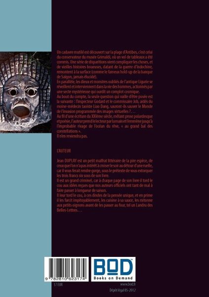Un cadavre mutilé est découvert sur la plage d'Antibes, c'est celui du conservateur du musée Grimaldi, où un vol de tableaux a été commis. Une série de disparitions vient compliquer les choses, et de vieilles histoires boueuses, datant de la guerre d'Indochine, remontent à la surface (comme le fameux hold-up de la banque de Saïgon, jamais élucidé).En parallèle, les dieux et monstres oubliés de l'antique Ligurie se réveillent et interviennent dans la vie des hommes, actionnés par une secte mystérieuse qui ourdit un complot cosmique.Au bout du compte, la seule question qui vaille d'être posée est la suivante : l'inspecteur Godard et le commissaire Job, aidés du moine-médecin taoïste Liao Dang, sauront-ils sauver le Monde de l'invasion programmée des images virtuelles ?...Au fil d'une écriture du XXIème siècle, mêlant prose polardesque et poésie, l'auteur prend le lecteur par la main et l'emmène jusqu'à l'improbable rivage de l'océan du rêve, « au grand bal des constellations ».Il n'en reviendra pas.