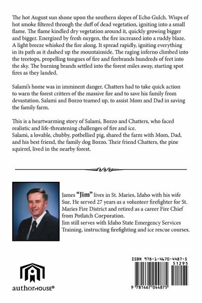 The hot August sun shone upon the southern slopes of Echo Gulch. Wisps of hot smoke filtered through the duff of dead vegetation, igniting into a small flame. The flame kindled dry vegetation around it, quickly growing bigger and bigger. Energized by fresh oxygen, the fire increased into a ruddy blaze. A light breeze whisked the fire along. It spread rapidly, igniting everything in its path as it dashed up the mountainside. The raging inferno climbed into the treetops, propelling tongues of fire and firebrands hundreds of feet into the sky. The burning brands settled into the forest miles away, starting spot fires as they landed. Salami's home was in imminent danger. Chatters had to take quick action to warn the forest critters of the massive fire and to save his family from devastation. Salami and Bozzo teamed up, to assist Mom and Dad in saving the family farm. This is a heartwarming story of Salami, Bozzo and Chatters, who faced realistic and life-threatening challenges of fire and ice. Salami, a lovable, chubby, potbellied pig, shared the farm with Mom, Dad, and his best friend, the family dog Bozzo. Their friend Chatters, the pine squirrel, lived in the nearby forest.