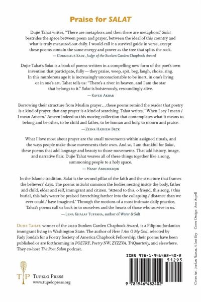 Dujie Tahat's Salat is a book of poems written in a compelling new form of the poet's own invention that participate, fully - they praise, weep, spit, beg, laugh, choke, sing. In this murderous age it is increasingly unconscionable to be inert, in one's living or in one's art. Tahat tells us: "There's a river in heaven, and I am the star that belongs to it." Salat is boisterously, resoundingly alive.