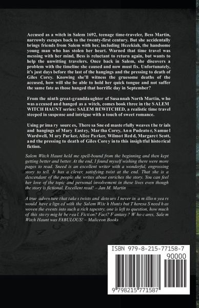 Accused as a witch in Salem 1692, teenage time-traveler, Bess Martin, narrowly escapes back to the twenty-first century. But she accidentally brings friends from Salem with her, including Hezekiah, the handsome young man who has stolen her heart. Warned that time travel was messing with her mind, Bess is reluctant to return again, but wants to help the unwitting travelers. Once back in Salem, she discovers a problem with the timeline she caused and now must fix. Unfortunately, it's just days before the last of the hangings and the pressing to death of Giles Corey. Knowing she'll witness the gruesome deaths of the accused, how will she be able to hold her quick tongue and not suffer the same fate as those hanged that horrific day in September? From the ninth great-granddaughter of Susannah North Martin, who was accused and hanged as a witch, comes book three in the SALEM WITCH HAUNT series: SALEM BEWITCHED, a realistic time travel steeped in suspense and intrigue with a touch of sweet romance. Using primary sources, Theresa Sneed masterfully weaves the trials and hangings of Mary Eastey, Martha Corey, Ann Pudeator, Samuel Wardwell, Mary Parker, Alice Parker, Wilmot Redd, Margaret Scott, and the pressing to death of Giles Corey into this insightful historical fiction.