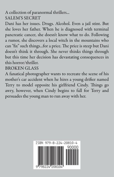 A collection of paranormal thrillers... SALEM'S SECRET Dani has her issues. Drugs. Alcohol. Even a jail stint. But she loves her father. When he is diagnosed with terminal pancreatic cancer, she doesn't know what to do. Following a rumor, she discovers a local witch in the mountains who can "fix" such things...for a price. The price is steep but Dani doesn't think it through. She never thinks things through but this time her decision has devastating consequences in this horror/thriller. BROKEN GLASS A fanatical photographer wants to recreate the scene of his mother's car accident when he hires a young drifter named Terry to model opposite his girlfriend Cindy. Things go awry, however, when Cindy begins to fall for Terry and persuades the young man to run away with her.