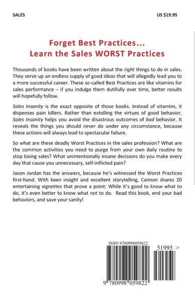 Thousands of books have been written about the right things to do in sales. Sales Insanity is the EXACT OPPOSITE of those books. Rather than extolling the virtues of good behavior, Sales Insanity helps you avoid the disastrous outcomes of bad sales behavior. It reveals the things you should NEVER do under any circumstance, because these actions always cause you to lose sales. So what are these deadly Worst Practices in sales? What unintentionally insane things do you do every day that cost you money? Jason Jordan has the answers, because he's witnessed the sales Worst Practices first-hand. With keen insight and excellent storytelling, Jason shares 20 entertaining stories that prove a point: While it's good to know what to do, it's even better to know what not to do. Read this book, laugh out loud, end your bad behaviors, and sell more! Note that this book is unlike Jason's best-selling book Cracking the Sales Management Code. Sales Insanity is meant to be both education and FUN! The tone is lighthearted, and the chapters short and digestible. Of course, with insights and learnings along the way.