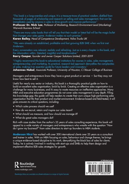Useful for nearly any sector or industry, this book is a thoroughly practical guide on how to build an excellent sales organisation, brick by brick. Creating an effective sales organisation is a challenge for many businesses, and it's easy to waste resources on ineffective approaches. Many MBA and executive education programmes do not cover sales management in any depth. Filling this knowledge gap, this guide will help readers to create their own unique high-performing sales organisation that fits their product and market environment. Evidence-based and field-tested, it will gives answers to critical questions, including: