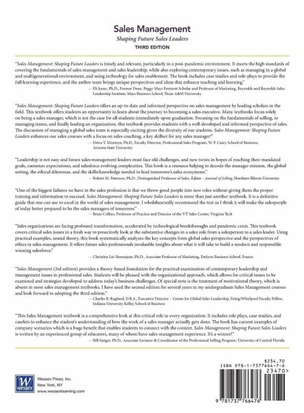 The emphasis of this textbook is on how sales management gets done. You will find contemporary materials in the content and application exercises, such as in the end-of-chapter questions, role plays, caselets, and cases. We developed the instructor materials in such a way that they facilitate how instructors teach the content using various modes (e.g., face-to-face, online, or hybrid models). To reflect the textbook's new organization, we provided an overview of the sales function and the role it plays in a firm's overall strategy and discuss industry priorities (e.g., lead generation and cross-selling). We expanded our content related to B2B sales and discuss the different roles salespeople play within those channels. In addition to introducing traditional leadership approaches, we refocused Chapter 2 on leadership development early in one's career and introduced the emergent leadership approach.