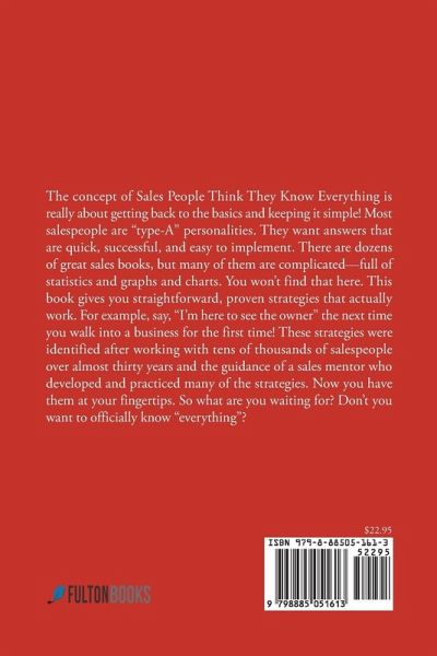 The concept of SalesPeople Think They know Everything is really about getting back to the basics and keeping it simple! Most salespeople are "type-A" personalities. They want answers that are quick, successful, and easy to implement. There are dozens of great sales books, but many of them are complicated--full of statistics and graphs and charts. You won't find that here. This book gives you straightforward, proven strategies that actually work. For example, say, "I'm here to see the owner" the next time you walk into a business for the first time! These strategies were identified after working with tens of thousands of salespeople over almost thirty years and the guidance of a sales mentor who developed and practiced many of the strategies. Now you have them at your fingertips. So what are you waiting for? Don't you want to officially know "everything"?