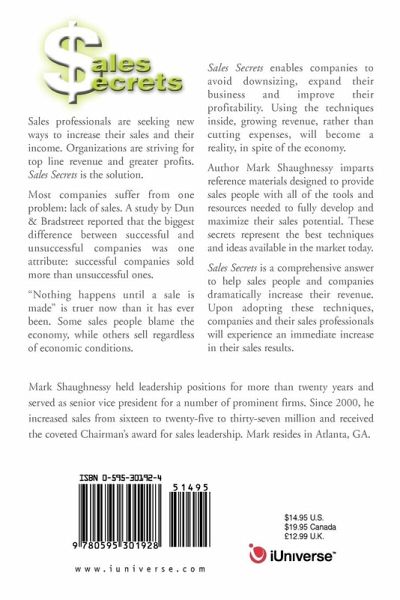 Sales professionals are seeking new ways to increase their sales and their income. Organizations are striving for top line revenue and greater profits. Sales Secrets is the solution. Most companies suffer from one problem: lack of sales. A study by Dun & Bradstreet reported that the biggest difference between successful and unsuccessful companies was one attribute: successful companies sold more than unsuccessful ones. "Nothing happens until a sale is made" is truer now than it has ever been. Some sales people blame the economy, while others sell regardless of economic conditions. Sales Secretsenables companies to avoid downsizing, expand their business and improve their profitability. Using the techniques inside, growing revenue, rather than cutting expenses, will become a reality, in spite of the economy. Author Mark Shaughnessy imparts reference materials designed to provide sales people with all of the tools and resources needed to fully develop and maximize their sales potential. These secrets represent the best techniques and ideas available in the market today. Sales Secrets is a comprehensive answer to help sales people and companies dramatically increase their revenue. Upon adopting these techniques, companies and their sales professionals will experience an immediate increase in their sales results.