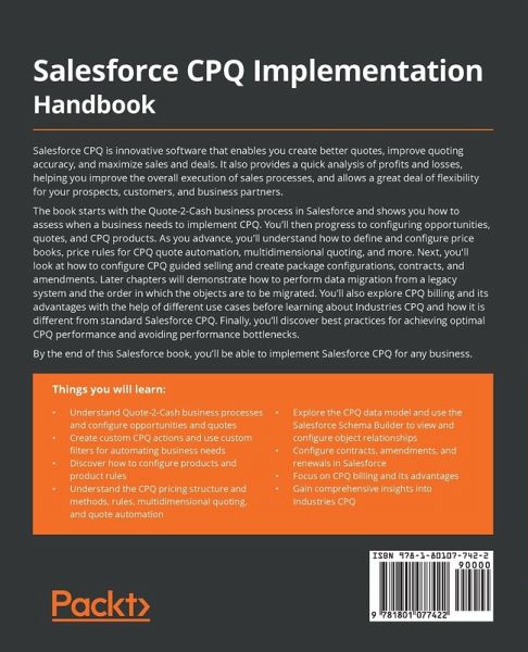 An end-to-end practical guide to implementing Salesforce CPQ solutions, shortening your sales cycle, and generating a higher ROI Key Features:Maximize sales by reducing turnaround time and providing a quick analysis of profits and losses Get up to speed with Salesforce CPQ concepts, best practices, and tips when choosing the right CPQ implementation strategy Implement CPQ configurations and automations for B2B and B2C business scenarios Book Description: Salesforce CPQ is innovative software that enables you create better quotes, improve quoting accuracy, and maximize sales and deals. It also provides a quick analysis of profits and losses, helping you improve the overall execution of sales processes, and allows a great deal of flexibility for your prospects, customers, and business partners. The book starts with the Quote-2-Cash business process in Salesforce and shows you how to assess when a business needs to implement CPQ. You'll then progress to configuring opportunities, quotes, and CPQ products. As you advance, you'll understand how to define and configure price books, price rules for CPQ quote automation, multidimensional quoting, and more. Next, you'll look at how to configure CPQ guided selling and create package configurations, contracts, and amendments. Later chapters will demonstrate how to perform data migration from a legacy system and the order in which the objects are to be migrated. You'll also explore CPQ billing and its advantages with the help of different use cases before learning about Industries CPQ and how it is different from standard Salesforce CPQ. Finally, you'll discover best practices for achieving optimal CPQ performance and avoiding performance bottlenecks. By the end of this Salesforce book, you'll be able to implement Salesforce CPQ for any business. What You Will Learn:Understand Quote-2-Cash business processes and configure opportunities and quotes Create custom CPQ actions and use custom filters for automating business needs Discover how to configure products and product rules Understand the CPQ pricing structure and methods, rules, multidimensional quoting, and quote automation Explore the CPQ data model and use the Salesforce Schema Builder to view and configure object relationships Configure contracts, amendments, and renewals in Salesforce Focus on CPQ billing and its advantages Gain comprehensive insights into Industries CPQ Who this book is for: This book is for Salesforce administrators, business analysts, functional consultants, sales managers, Salesforce architects, and those looking to gain Salesforce CPQ certification. Working knowledge of the Salesforce ecosystem is recommended to get the most out of this book.