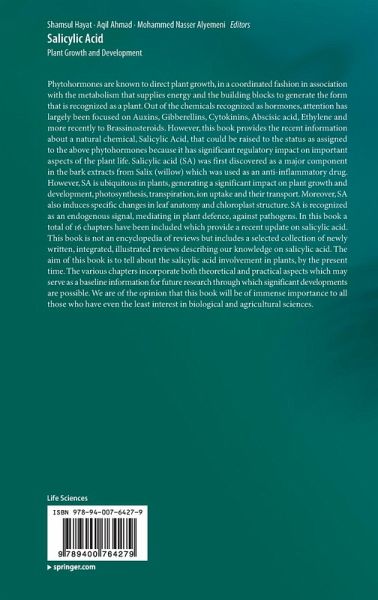 Preface.- Contributors.- About the editors.- 1. Salicylic acid: An update on biosynthesis and action in plant response to water deficit and performance under drought.- 2. Salicylic acid: Physiological roles in plants.- 3. Salicylic acid and phospholipid signaling.- 4. Transport of salicylic acid and related compounds.- 5. Interplay between environmental signals and endogenous salicylic acid concentration.- 6.Impact of salicylic acid on the transport and distribution of sugars in plants.- 7. Endogenous ABA as a hormonal intermediate in the salicylic acid induced protection of wheat plants against toxic ions.- 8. Salicylic acid biosynthesis and role in modulating terpenoid and flavonoid metabolism in plant responses to abiotic stress.- 9. Salicylic acid-mediated stress-induced flowering.- 10. Salicylic acid-mediated abiotic stress tolerance.- 11. Signaling role of salicylic acid in abiotic stress responses in plants.- 12. The interplay between salicylic and jasmonic acid during phytopathogenesis.- 13. Potential benefits of salicylic acid in food production.- 14. Short and long term effects of salicylic acido n protection to phytoplasma associated stress in potato plants.- 15. Efficiency of salicylic acid application on postharvest perishable crops.- 16. Recent advances and future prospects on practical use of salicylic acid.