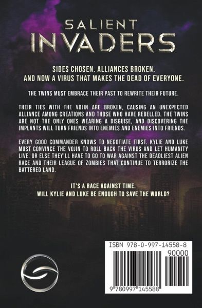 Sides chosen. Alliances broken. And now a virus that makes the dead of everyone. The twins must embrace their past to rewrite their future. Their ties with the Vojin are broken, causing an unexpected alliance among Creations and those who have rebelled. The twins are not the only ones wearing a disguise, and discovering the implants will turn friends into enemies and enemies into friends. Every good commander knows to negotiate first. Kylie and Luke must convince the Vojin to roll back the virus and let humanity live. Or else they'll have to go to war against the deadliest alien race and their league of Zombies that continue to terrorize the battered land. It's a race against time. Will Kylie and Luke be enough to save the world? Find out in this exciting second installment of this young adult post-apocalyptic series. If you love gritty, fast-paced action in a Zombie and alien infested dystopian world, you'll love Salient Invaders. Reading Order: Inception: Prequel Imminent Threat: Book 1 Salient Invaders: Book 2 Ominous Order: Book 3