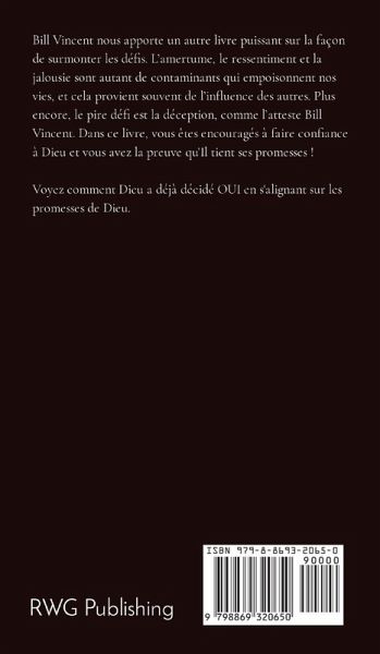 Bill Vincent nous apporte un autre livre puissant sur la façon de surmonter les défis. L'amertume, le ressentiment et la jalousie sont autant de contaminants qui empoisonnent nos vies, et cela provient souvent de l'influence des autres. Plus encore, le pire défi est la déception, comme l'atteste Bill Vincent. Dans ce livre, vous êtes encouragés à faire confiance à Dieu et vous avez la preuve qu'Il ¿¿tient ses promesses ! Voyez comment Dieu a déjà décidé OUI en s'alignant sur les promesses de Dieu.