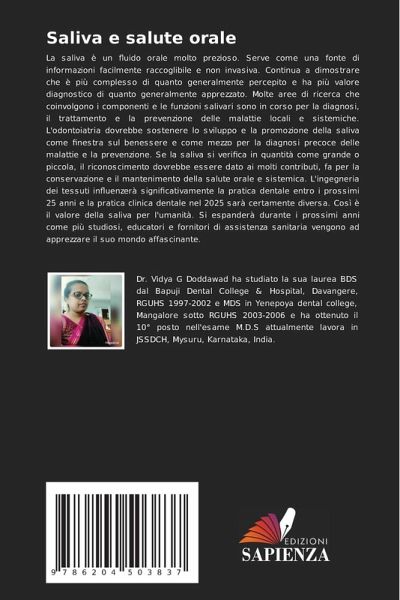 La saliva è un fluido orale molto prezioso. Serve come una fonte di informazioni facilmente raccoglibile e non invasiva. Continua a dimostrare che è più complesso di quanto generalmente percepito e ha più valore diagnostico di quanto generalmente apprezzato. Molte aree di ricerca che coinvolgono i componenti e le funzioni salivari sono in corso per la diagnosi, il trattamento e la prevenzione delle malattie locali e sistemiche. L'odontoiatria dovrebbe sostenere lo sviluppo e la promozione della saliva come finestra sul benessere e come mezzo per la diagnosi precoce delle malattie e la prevenzione. Se la saliva si verifica in quantità come grande o piccola, il riconoscimento dovrebbe essere dato ai molti contributi, fa per la conservazione e il mantenimento della salute orale e sistemica. L'ingegneria dei tessuti influenzerà significativamente la pratica dentale entro i prossimi 25 anni e la pratica clinica dentale nel 2025 sarà certamente diversa. Così è il valore della saliva per l'umanità. Si espanderà durante i prossimi anni come più studiosi, educatori e fornitori di assistenza sanitaria vengono ad apprezzare il suo mondo affascinante.