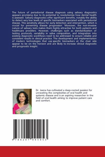 The future of periodontal disease diagnosis using salivary diagnostics appears promising due to its potential to revolutionize how dental health is assessed. Salivary diagnostics offer significant benefits, notably the ability to detect very low levels of specific biomarkers associated with periodontal disease. This sensitivity allows for early detection and intervention, which is crucial for preventing disease progression. Moreover, the non-invasive nature of salivary tests makes them highly attractive for both patients and healthcare providers. However, challenges such as standardization of testing protocols, variability in saliva composition, and integration into existing diagnostic workflows need to be addressed to ensure reliable and consistent results in clinical practice. The development and implementation of modern technologies that use specific biomarkers at the chair side appear to be on the horizon and are likely to increase clinical diagnostic and prognostic insight.