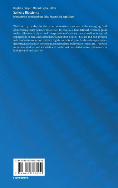 Part 1: What is Salivary Bioscience, Why is it Important, and How Do We Study It?.- Chapter 1: Foundations of Interdisciplinary Salivary Bioscience: An Introduction (Granger et al.).- Chapter 2: Salivary Gland Anatomy and Physiology (Hernández et al.).- Chapter 3: Saliva Collection, Handing, Transport, and Storage: Special Considerations and Best Practices for Interdisciplinary Salivary Bioscience(Padilla et al.).- Chapter 4: Analytical Strategies and Tactics in Salivary Bioscience (Riis et al.).- Part 2: Physiology and Development Research and Applications (Part 2 Editor: Dr. Jenna Riis).- Chapter 5: Salivary Bioscience, Human Stress, and the Hypothalamic Pituitary Adrenal Axis (Clow et al.).- Chapter 6: The Use of Saliva for Genetics and Epigenetics Research (Nemoda et al.).- Chapter 7: Saliva as a Window Into the Human Oral Microbiome and Metabolome(Whiteson et al.).- Chapter 8: Salivaomics, saliva Exo-somics, and Saliva Liquid Biopsy (Wong et al.).- Chapter 9: Salivary Bioscience, Immunity, and Inflammation (Riis et al.).- Chapter 10:Salivary Bioscience and Human Development (Hibel et al.).- Part 3: Biomedical Research and Related Applications (Part 3 Editor: Dr. Elizabeth Thomas).- Chapter 11: Biomedical Research and Related Applications:Current Assay Methods and Quality Requirements in Oral Fluid Diagnostics Applications (Granger S. et al.).- Chapter 12: Salivary Biomarkers and Neurodegenerative Conditions (Thomas et al.).- Chapter 13: The Use of Antibodies in Saliva to Measure PathogenExposure and Infection(Heaney et al.).- Chapter 14: Salivary Bioscience and Pain (Payne et al.).- Chapter 15: Salivary Bioscience and Environmental Exposure Assessment (Panuwet et al.).- Chapter 16: Saliva and Drugs of Abuse (Navazesh et al.).- Chapter 17: Therapeutic Drug Monitoring in Saliva (Thomas).- Chapter 18: Salivary Bioscience and Periodontal Medicine (Freire et al.).- Chapter 19: Salivary Bioscience and Cancer (Navazesh et al.).- Part 4: Psychosocial Research and Applications(Part 4 Editor: Dr. Kate Ryan Kuhlman).- Chapter 20: Salivary Bioscience in Clinical Psychologyand Psychiatry(Kuhlman).- Chapter 21: Salivary Bioscience Research in Health Psychology and Behavioral Medicine (Hoyt et al.).- chapter 22: The Neuroscience of Human Social Behavior: A Review of How Testosterone and Cortisol Underpin Competition and Affiliation Dynamics (Kornienko et al.).- chapter 23: Salivary Studies of the Social Neuroscience of Human-animal Interaction (Pendry et al.).- Part 5: Population Health Research and Applications(Part 5 Editor: Dr. Marcus Taylor).- Chapter 24: Salivary Bioscience and Military, Space, and OperationalResearch(Roma et al.).- Chapter 25: Salivary Bioscience Research Related to Prenatal Adversity (Eiden et al.).- Chapter 26: Salivary Bioscience and Pediatrics (Johnson et al.).- Chapter 27: Use of saliva to better understand the experience of adulthood and aging(Almeida et al.).- Chapter 28: Salivary Bioscience and Research on Animal Welfare and Conservation Science(Staley et al.).- Part 6: The Way Forward: Future Directions for the Science and Practice of Salivary Bioscience.- Chapter 29:Applications of Salivary Bioscience to Precision Medicine (Kuhlman).- Chapter 30:Public Health and IndustryApplications of Salivary Bioscience (Riis et al.).- Chapter 31: Envisioning the Future of Interdisciplinary Salivary Bioscience (Granger et al.).