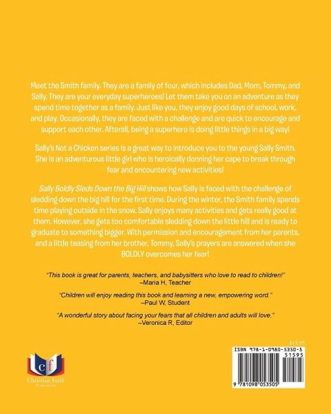 Meet the Smith family. They are a family of four, which includes Dad, Mom, Tommy, and Sally. They are your everyday superheroes! Let them take you on an adventure as they spend time together as a family. Just like you, they enjoy good days of school, work, and play. Occasionally, they are faced with a challenge and are quick to encourage and support each other. Afterall, being a superhero is doing little things in a big way! Sally's Not a Chicken series is a great way to introduce you to the young Sally Smith. She is an adventurous little girl who is heroically donning her cape to break through fear and encountering new activities! Sally Boldly Sleds down the Big Hill shows how Sally is faced with the challenge of sledding down the big hill for the first time. During the winter, the Smith family spends time playing outside in the snow. Sally enjoys many activities and gets really good at them. However, she gets too comfortable sledding down the little hill and is ready to graduate to something bigger. With permission and encouragement from her parents, and a little teasing from her brother, Tommy, Sally finds strength, from God, to break through her fear. Learn a new word: Boldly - in a confident and courageous way.