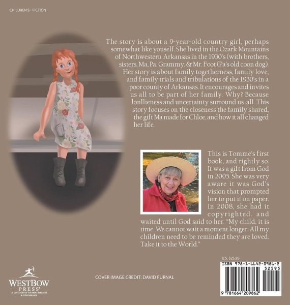 The story is about a 9-year-old country girl, perhaps somewhat like youself. She lived in the Ozark Mountains of Northwestern Arkansas in the 1930's (with brothers, sisters, Ma, Pa, Grammy, & Mr. Foot (Pa's old coon dog). Her story is about family togetherness, family love, and family trials and tribulations of the 1930's in a poor county of Arkansas. It encourages and invites us all to be part of her family. Why? Because lonllieness and uncertainty surround us all. This story focuses on the closeness the family shared, the gift Ma made for Chloe, and how it all changed her life.