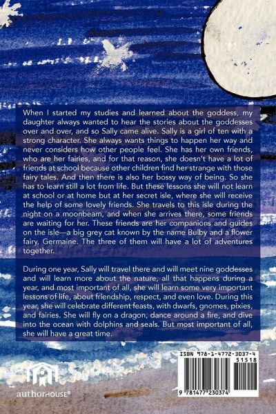 When I started my studies and learned about the goddess, my daughter always wanted to hear the stories about the goddesses over and over, and so Sally came alive. Sally is a girl of ten with a strong character. She always wants things to happen her way and never considers how other people feel. She has her own friends, who are her fairies, and for that reason, she doesn't have a lot of friends at school because other children find her strange with those fairy tales. And then there is also her bossy way of being. So she has to learn still a lot from life. But these lessons she will not learn at school or at home but at her secret isle, where she will receive the help of some lovely friends. She travels to this isle during the night on a moonbeam, and when she arrives there, some friends are waiting for her. These friends are her companions and guides on the isle-a big gray cat known by the name Bulby and a flower fairy, Germaine. The three of them will have a lot of adventures together. During one year, Sally will travel there and will meet nine goddesses and will learn more about the nature of all that happens during a year, and most important of all, she will learn some very important lessons of life, about friendship, respect, and even love. During this year, she will celebrate different feasts, with dwarfs, gnomes, pixies, and fairies. She will fly on a dragon, dance around a fire, and dive into the ocean with dolphins and seals. But most important of all, she will have a great time.